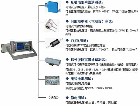 气象局防雷中心,是专门开展雷电防护工作的专业技术服务机构,按行政区域下设防雷装置安全检测站,负责区域内的防雷检测技术服务工作,依据GB/T 21431-2008《建筑物防雷装置检测技术规范》进行防雷工程竣工验收、防雷装置年度安全检测,其中电涌保护器的检测是其中的一项重要工作内容。 THNET-SPD- I型电涌保护器检测仪”是专用于检测电涌保护器(SPD)中使用的限压型电涌保护器件(压敏电阻器、氧化锌避雷器、稳压管、TVS管)和开关型电涌保护器件(气体放电管、空气间隙放电器)的直流伏安特性的测试仪器。 防雷元件的直流电气参数测试主要包括下列内容: (1) 放电管:直流放电电压值。 (2) 压敏电阻器:直流标称导通电压Vn (或V1mA)值和0.75V1mA电压下的漏电流值。 (3) TVS管(瞬态二极管):直流起始动作电压值。 (4) 固体放电管(防雷晶闸管):直流起始动作电压值。 (5) 限压型电涌保护器:直流标称导通电压V1mA值和0.75V1mA电压激励时的漏电流值。 (6) 开关型防雷保护器:在100V/S上升速率的斜波直流电压激励条件下的直流击穿电压值。