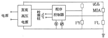 人工按一下检测量钮,便启动直流压电源,由程序控制器从FL上采样,产生nmA的恒流通过试品,经FY自动测量UnmA值,然后又由程序控制器发出指令产生0.5UnmA的恒定电压加在试品上,进而从FL上测得流过MOA的电流Id。